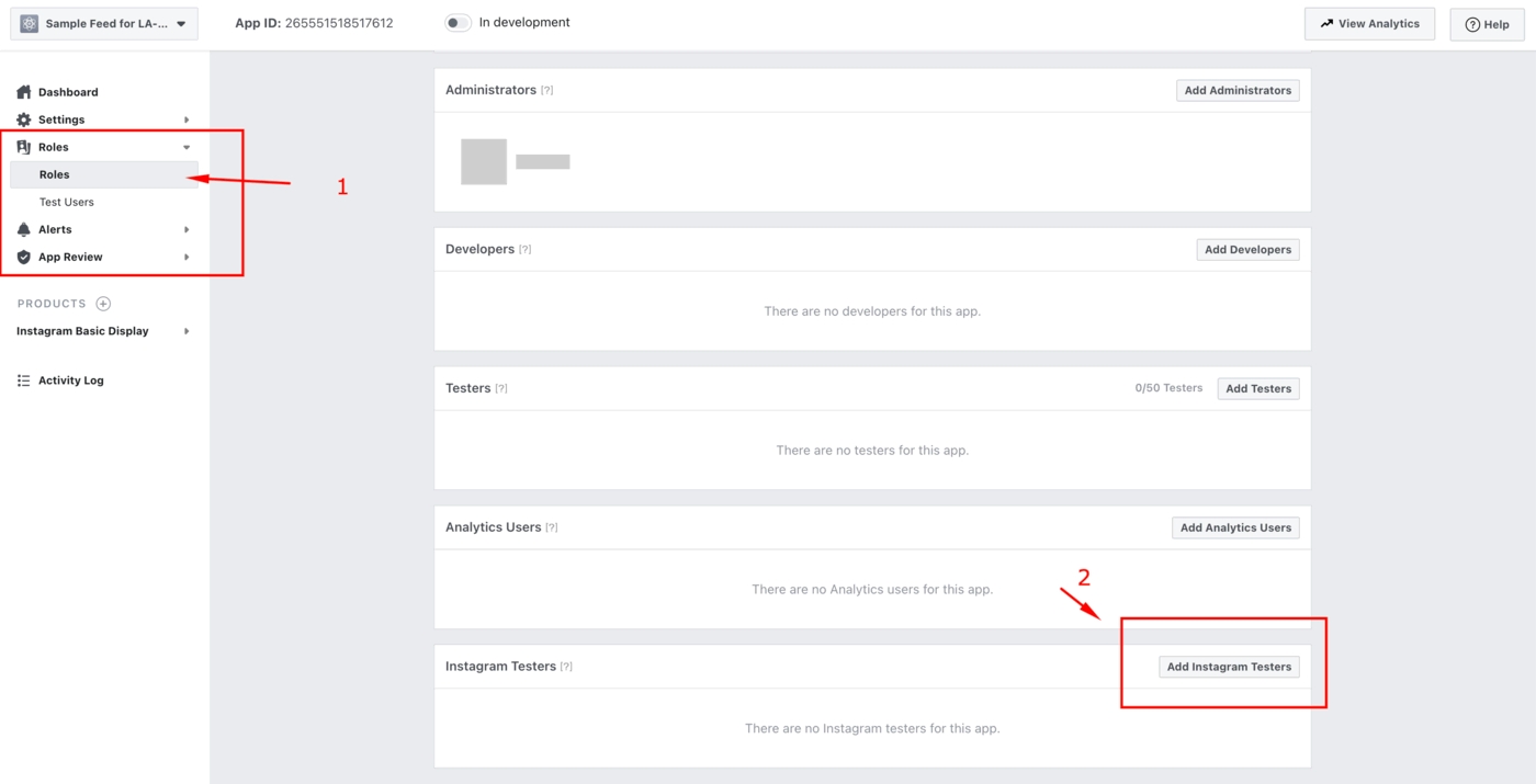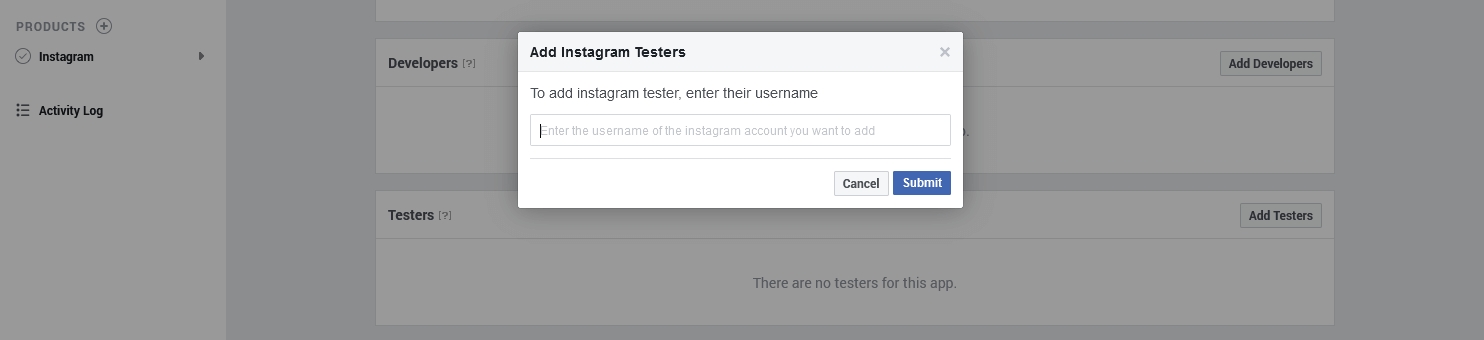 Navigate to Roles > Roles and scroll down to the Instagram Testers section. Click Add Instagram Testers and enter your Instagram account’s username and send the invitation.
