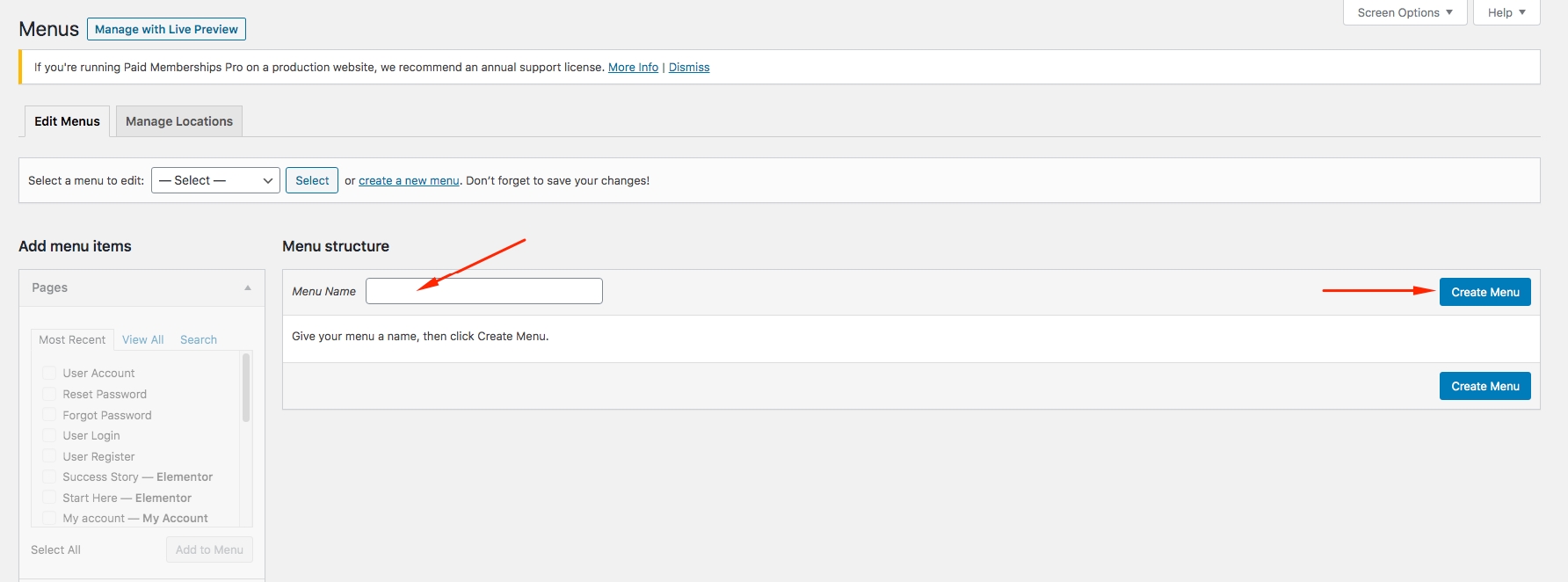 Step 1: Navigate to Apperance > Menus in your admin sidebar and click Create a new menu option.