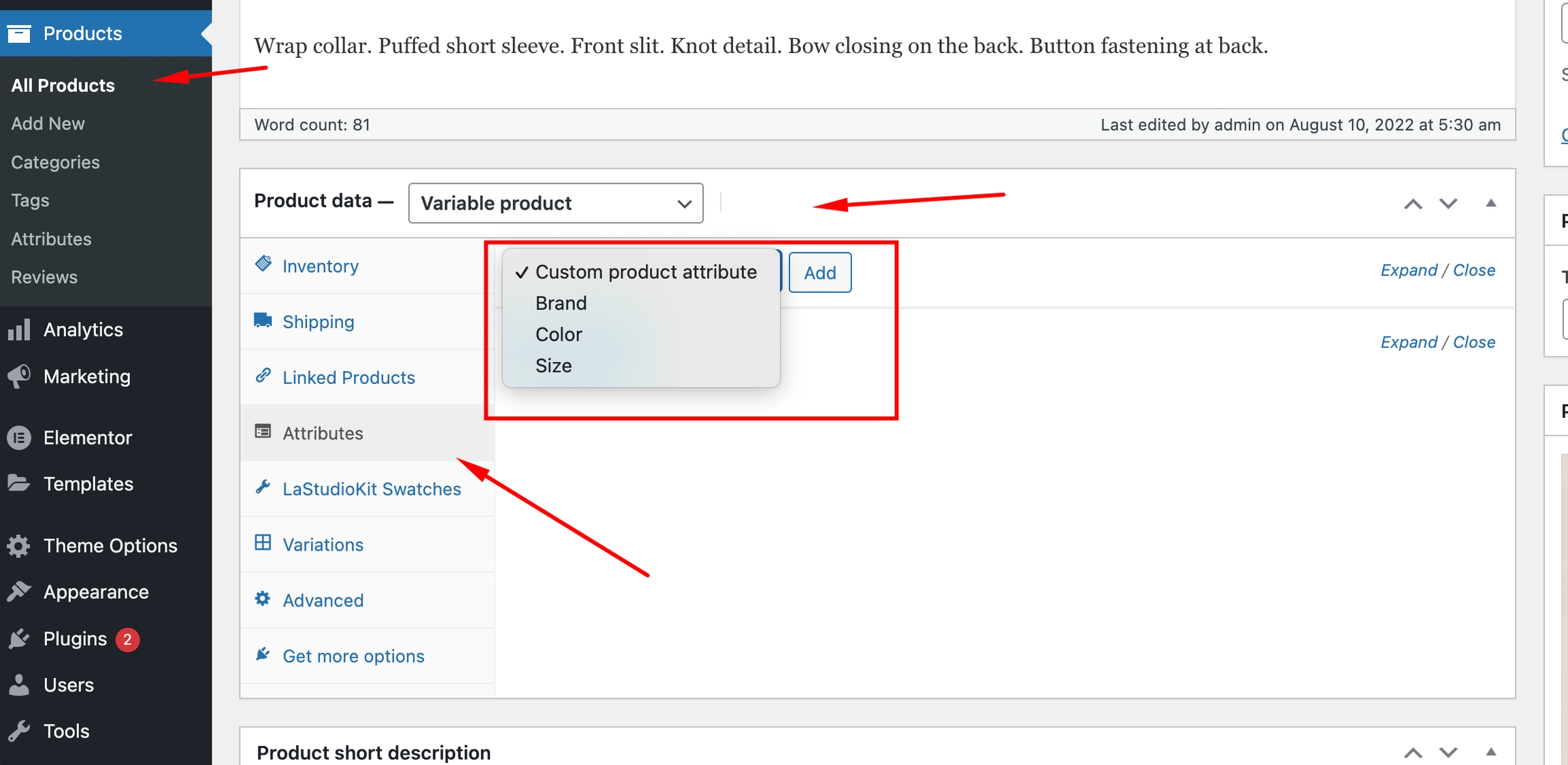 Step 2: Select the product you want to set Product variation swatches. At the Product data section, select Product type as Variable product. Step 3: Choose tab Attributes > Add the attribute you've just created
