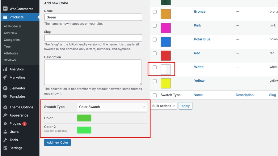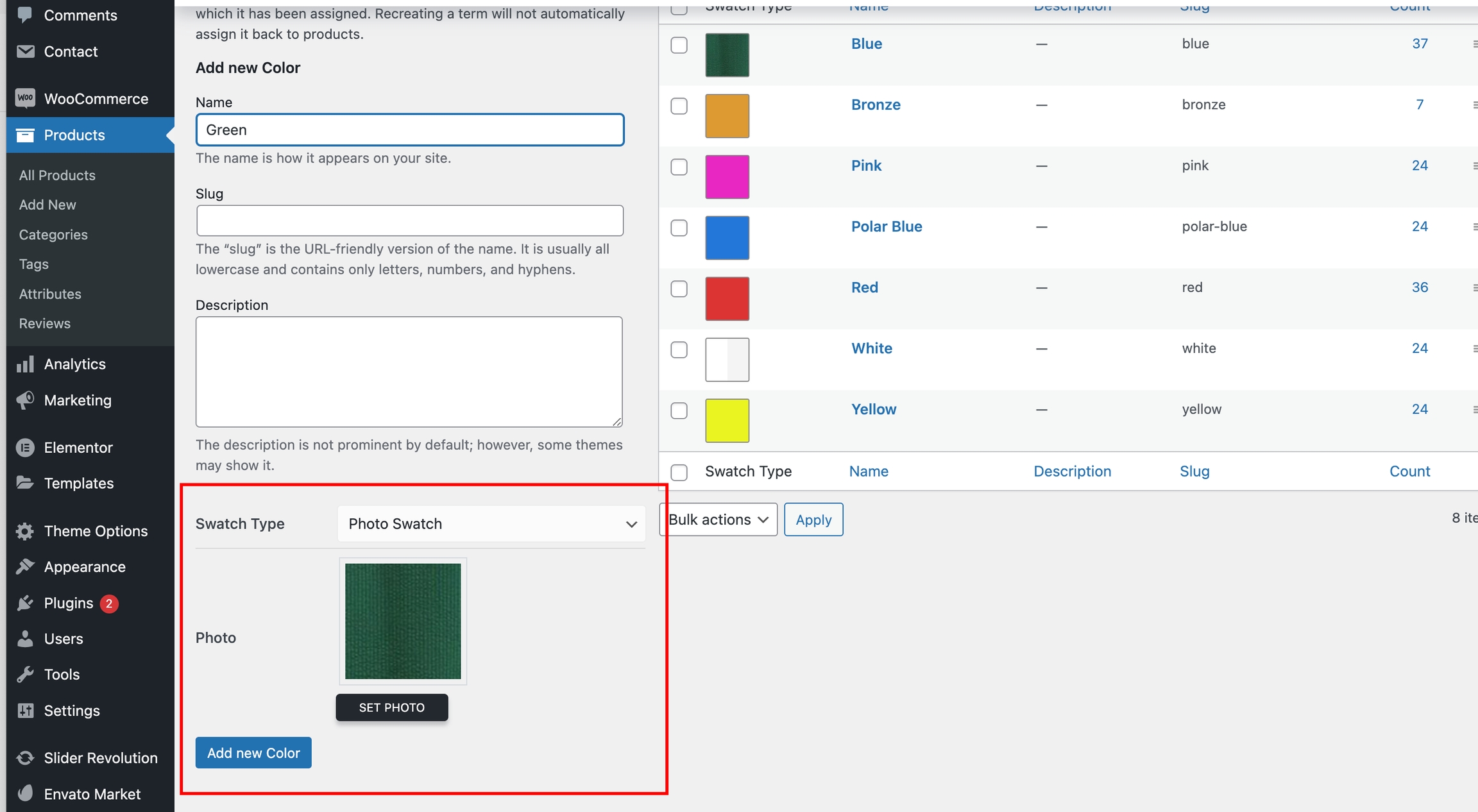 Taxonomy Colors and Images. The options of the global attribute will be offered. (Only available for global attributes.)