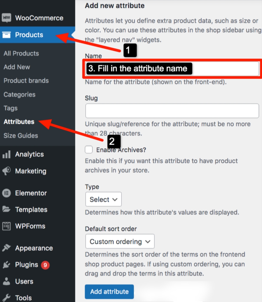 Step 2: Fill in the Attribute name (such as Size, Color, Image, etc)