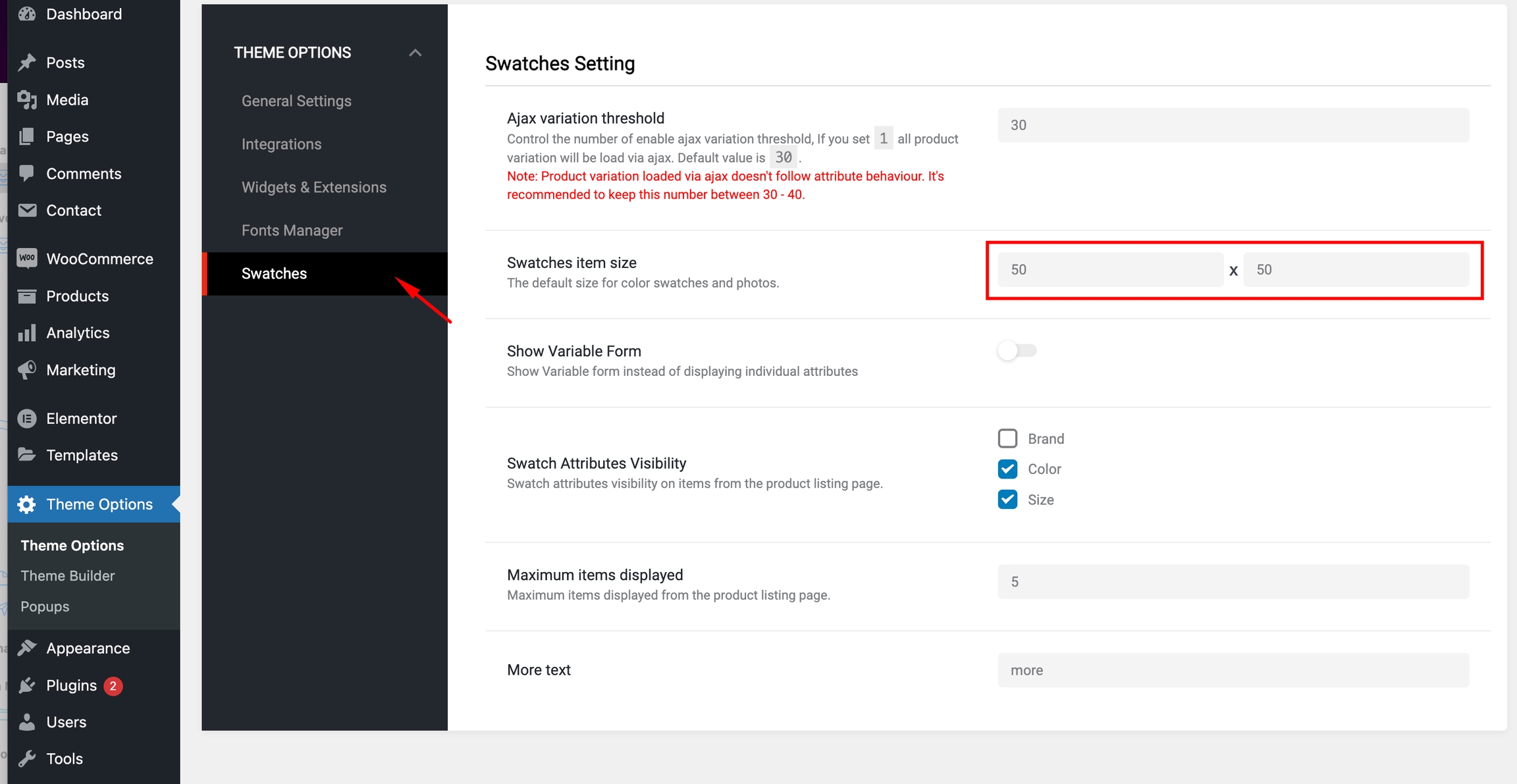 6. Select the size of the swatches if you’ve selected “Custom Colors and Images”. This will determine how large the swatches will be on the product page.