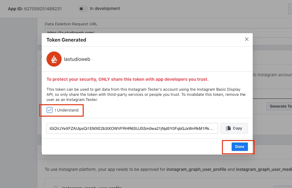 Click on “I understand” checkbox then copy your Instagram Access Token.
