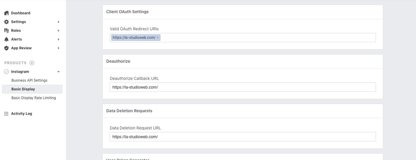 Navigate to App Dashboard > Products > Instagram > Basic Display page and scroll down to User Token Generator section. Click on “Generate Token” button.