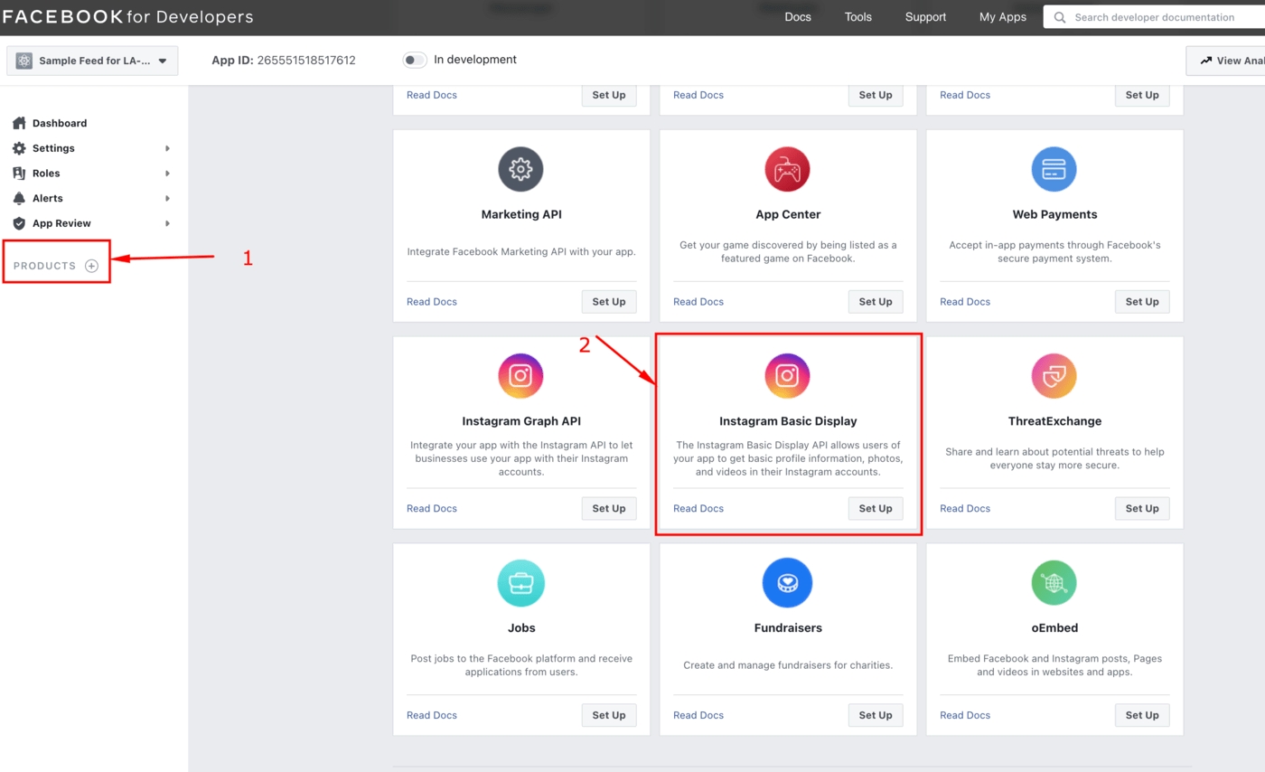 Click Products, locate the Instagram Basic Display product, and click Set Up to add it to your app.