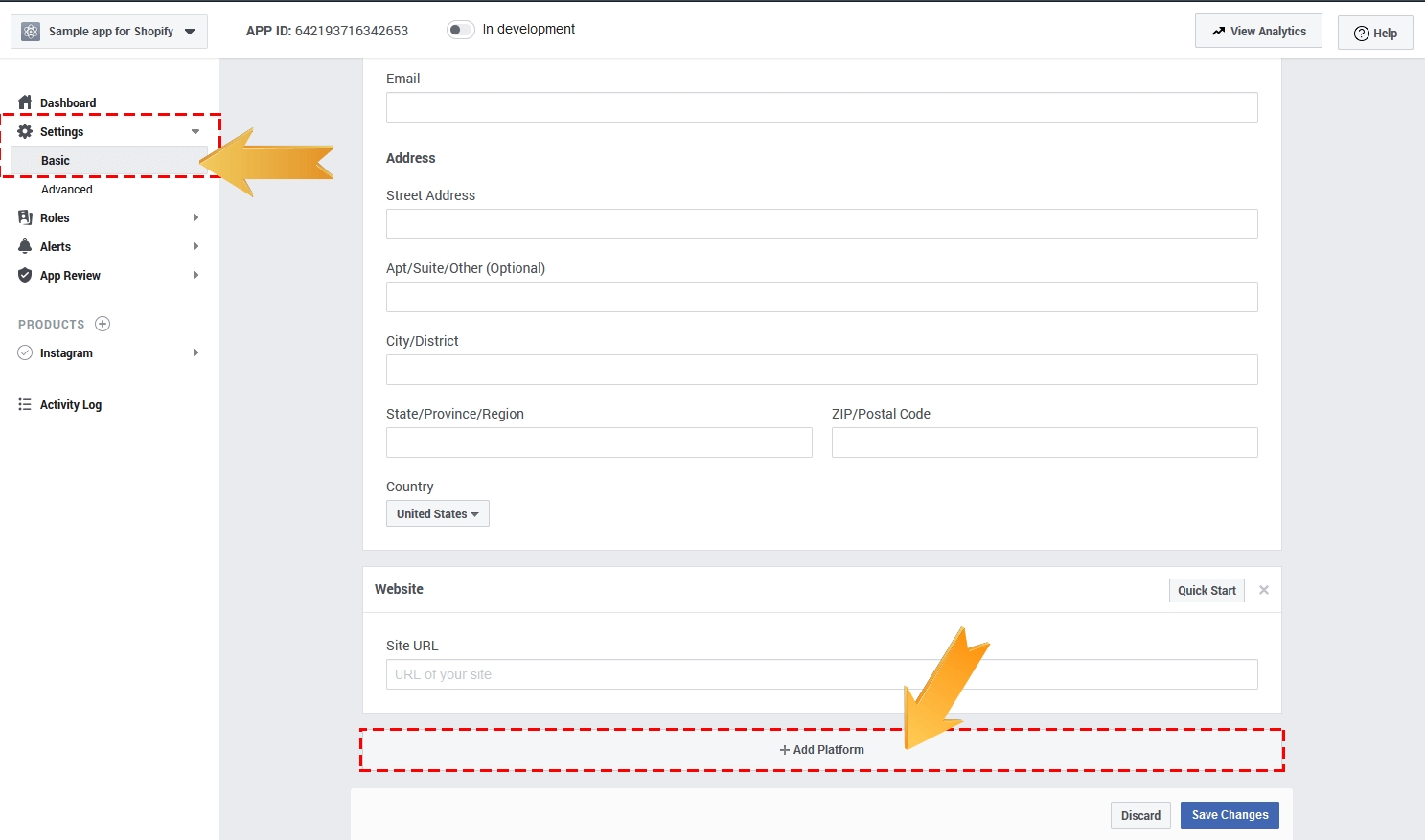 Once you have created the app and are in the App Dashboard, navigate to Settings > Basic, scroll the bottom of the page, and click Add Platform.
