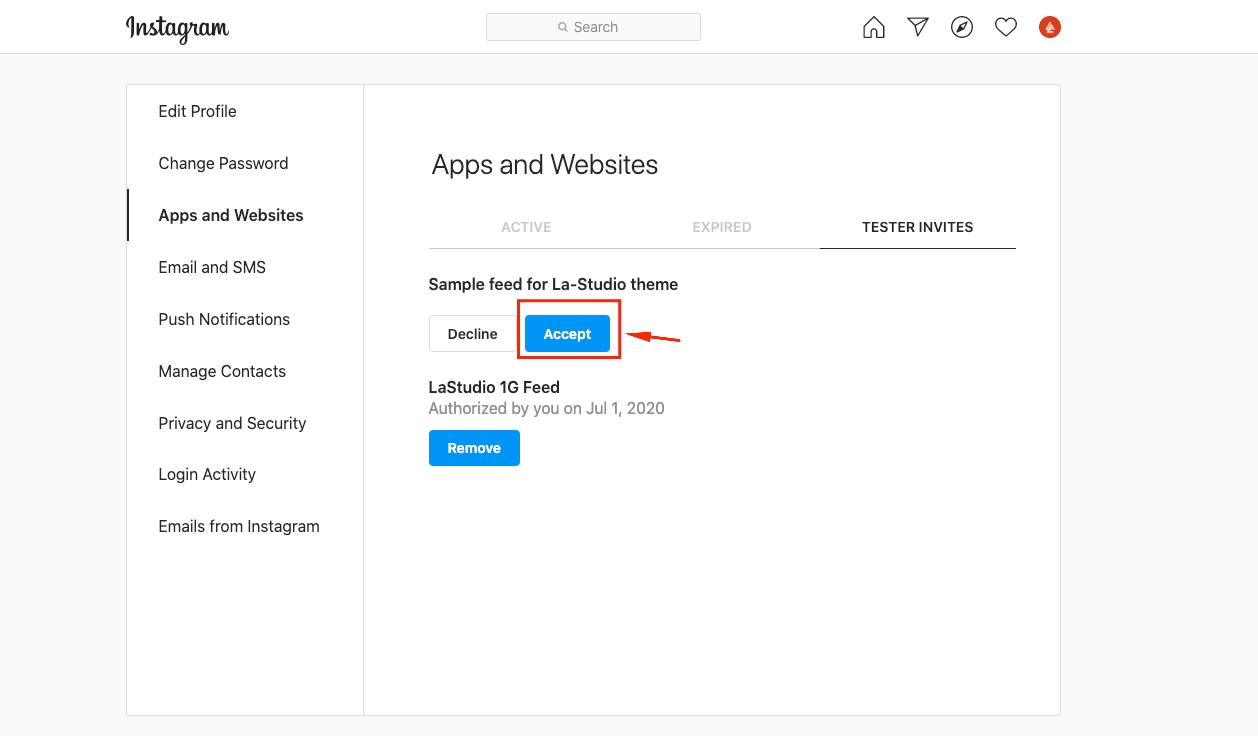 Open a new web browser and go to www.instagram.com and sign in to your Instagram account that you just invited. Navigate to (Profile Icon) > Click on the cogwheel icon next to “Edit Profile” button > Apps and Websites > Tester Invites and accept the invitation.