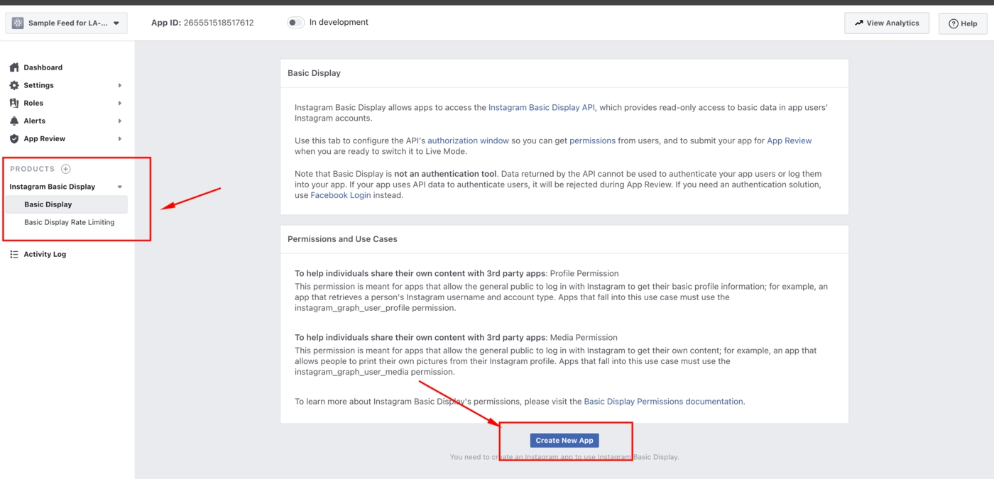Click Basic Display, scroll to the bottom of the page, then click Create New App.