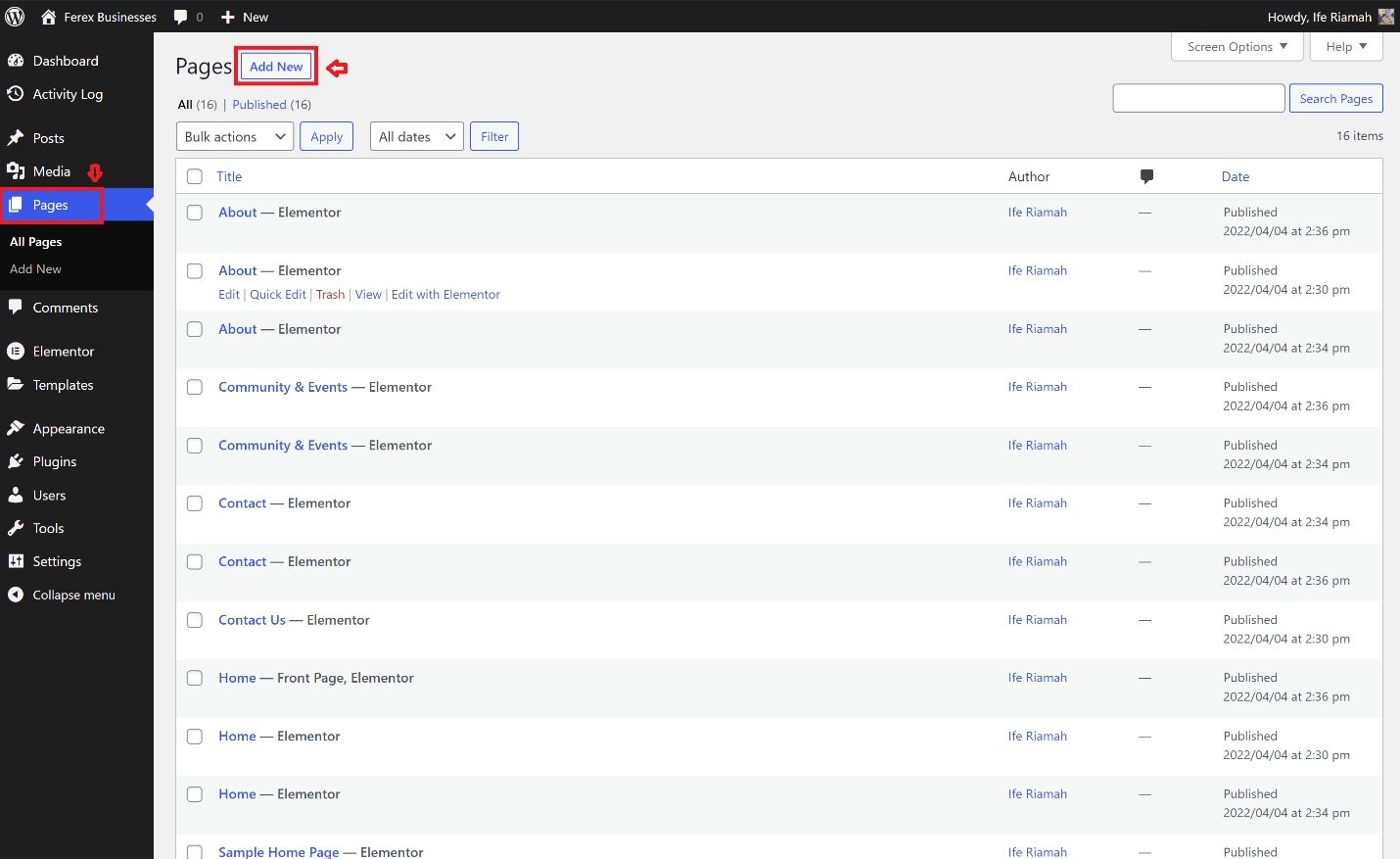 For existing pages, you can select Edit with Elementor directly from the WordPress dashboard.