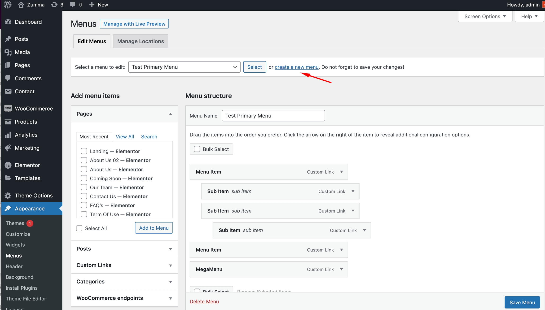 Step 1: Navigate to Apperance > Menus in your admin sidebar and click Create a new menu option.