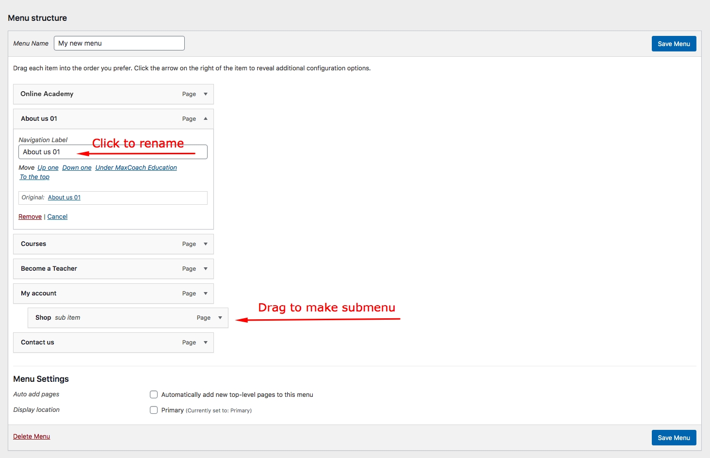 Step 2: Rename menu name as you wish. If you want to add more menu items, choose them from the left and hit Add to menu.